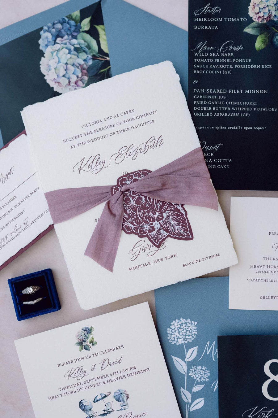 Kelley and David’s beach-inspired wedding invitations take a walk on the wild side. Deep ocean blues contrast with moody mauve florals for a vintage vibe you won’t want to miss. On the far eastern end of Long Island, Montauk is...